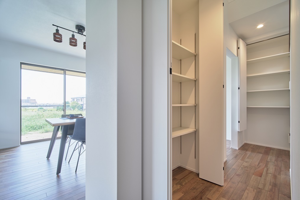 リビングからは丸見えにならない、裏動線に収納を集約しましたので、リビングはすっきりとお使いいただけます。
