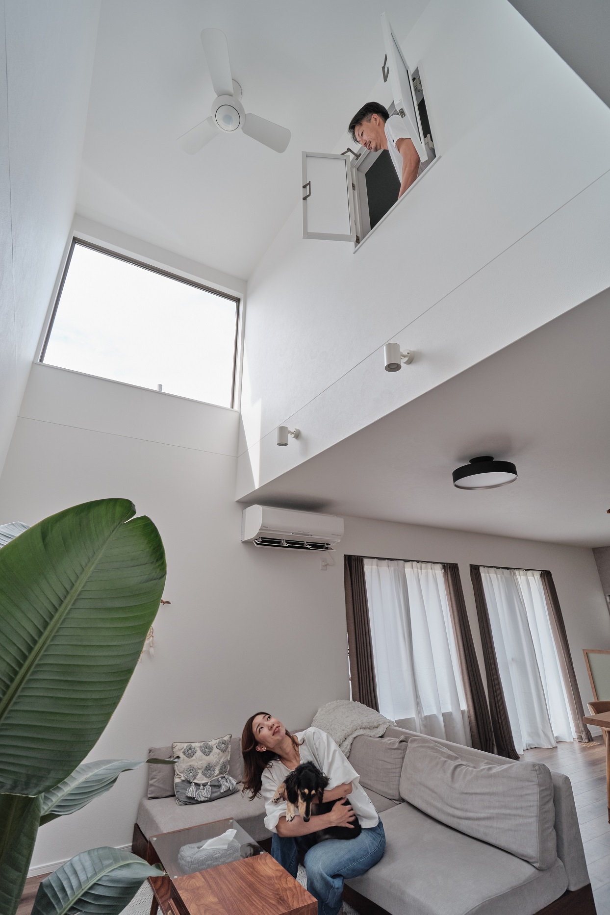 これまで、たくさんの国の空を見てこられたH様にぴったりの大きな吹き抜けは開放感があり、いつでも空の顔色を伺うことができます。また、吹き抜け部分に面する2階の洋室には『ヤッホー窓』を取り付けており、窓から下を覗くと1~2階間でも常に家族の存在が感じられるようになっています。吹き抜けがあるおかげで、天気が良ければ電気も不要でお財布にも優しい設計となっております。